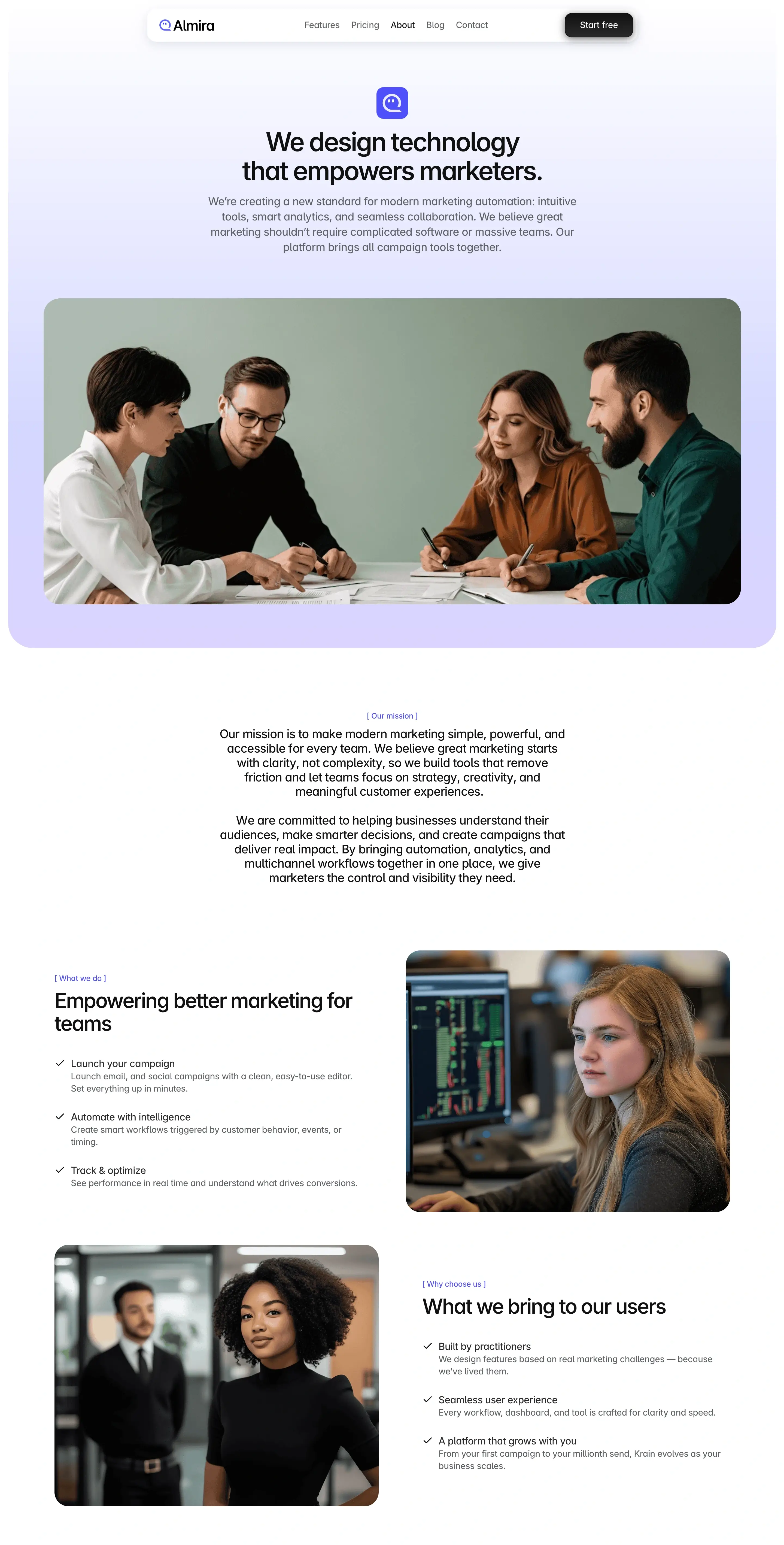 Almira is a SaaS landing template for startups to present product value, features, pricing, and content with a conversion-first structure.