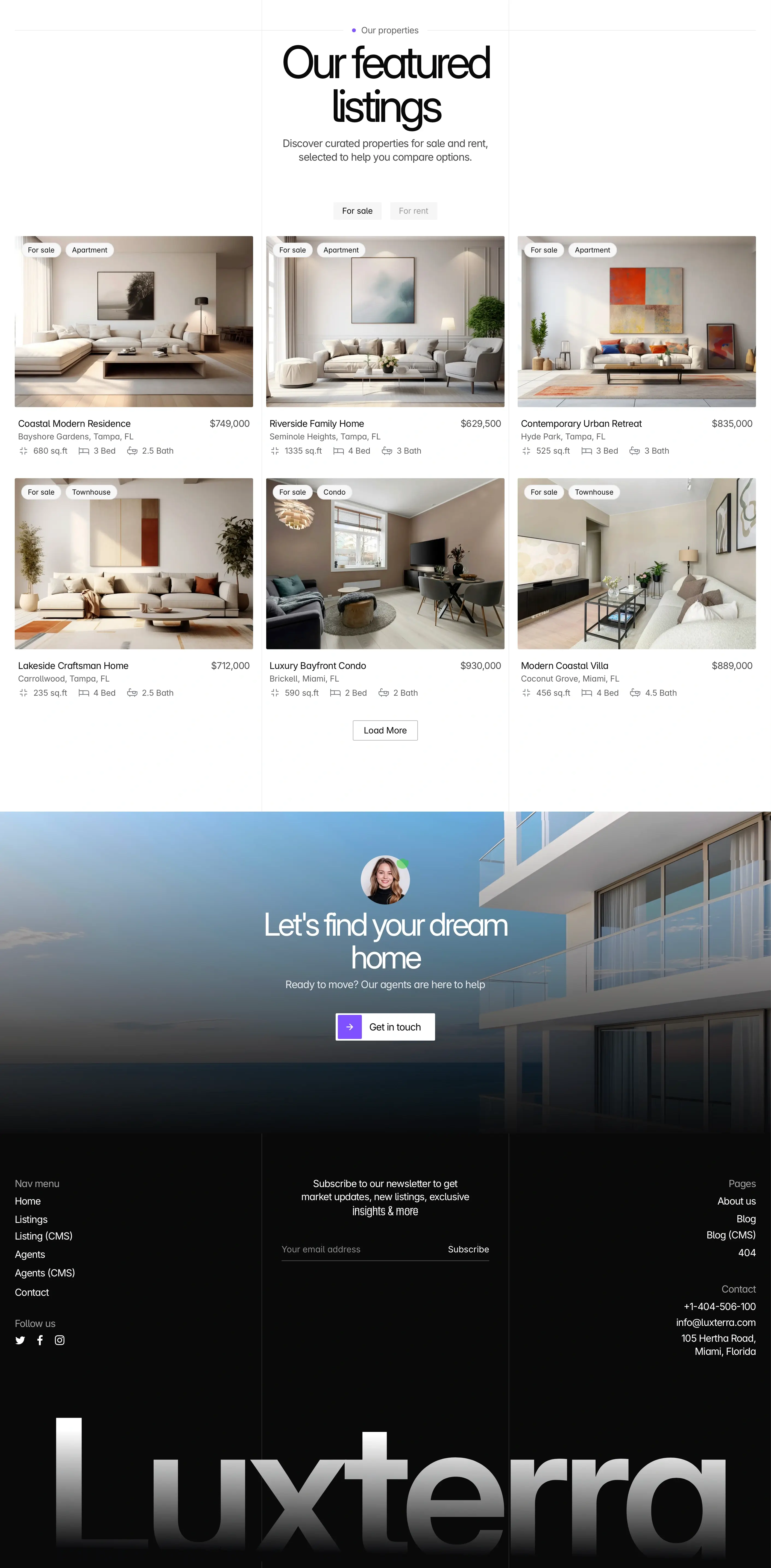Luxterra is a premium Framer template crafted for real estate agencies, brokers, and property professionals who want a refined, high-trust online presence. Built with clean layouts, modern typography, and a conversion-focused structure, it helps you present listings and services with clarity and credibility.